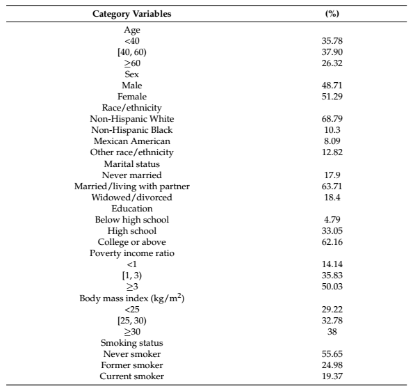 在这项研究中共纳入了 26,254 人。在这些参与者中,12,788 人(48.71%)为男性,13,466 人(51.29%)为女性,且性别分布均衡。表 1 详细介绍了参与者的各种特征,其中有相当大比例的样本(占 62.16%)具有大学或以上教育水平。