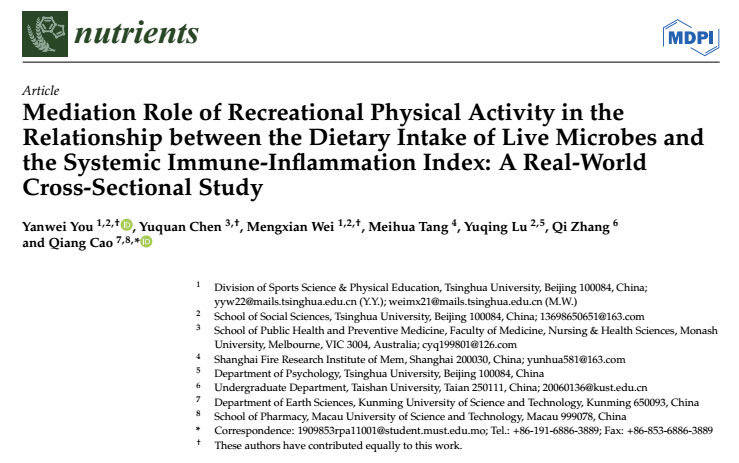 近期,来自中国清华大学、澳大利亚蒙纳士大学等的研究人员联合在Nutrients上发表题为“Mediation Role of Recreational Physical Activity in the Relationship between the Dietary Intake of Live Microbes and the Systemic Immune-Inflammation Index: A Real-World Cross-Sectional Study”。他们发现,中等LMC含量的食物,以及更多的RPA,与SII之间具有显著负相关性。