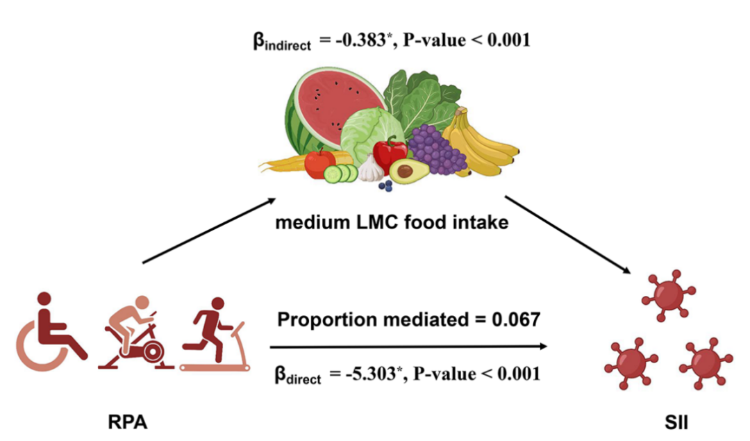 本研究表明:(1)中等LMC食物摄入量较高的群体与较低的SII相关;(2)进行更多RPA与较低的SII相关;(3)RPA是介导中等LMC食物与SII之间关联的重要因素。