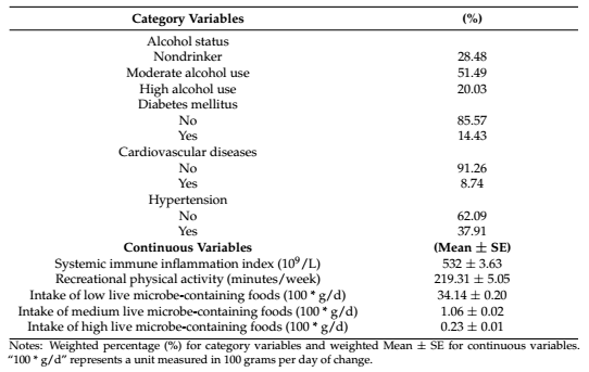 在饮食习惯方面,研究队列平均每天食用:3414 g低含活微生物(LMC)含量食品、 106 g中LMC含量食品和23 g高LMC含量食品。平均参与娱乐性体育活动(RPA)的时间:平均每周 219.31 分钟,高于世界卫生组织的建议(每周至少 150 分钟)。系统免疫炎症指数(SII——此研究中的一个关键参数)平均得分:532 分。