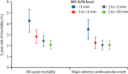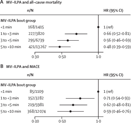 如果MV-ILPA中至少有15%是高强度运动的话,即使是少于1分钟的MV-ILPA,也有降低MACE风险的益处;如果是1-3分钟的MV-ILPA中有15%的高强度运动(每次9-27秒)的话,MACE事件风险可下降33%;如果是3-5分钟的MV-ILPA中有12%的高强度运动(每次27至45秒)的话,MACE事件风险可下降44%。