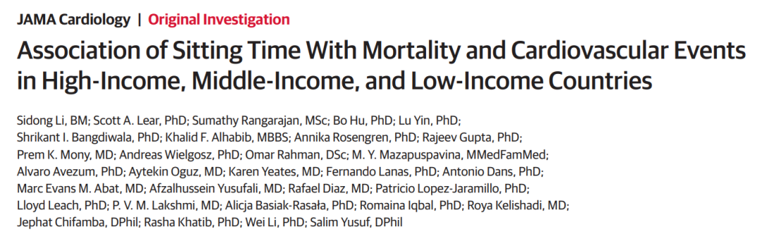 [1] Li S, Lear SA, Rangarajan S, Hu B, et al. Association of Sitting Time With Mortality and Cardiovascular Events in High-Income, Middle-Income, and Low-Income Countries. JAMA Cardiol. 2022 Jun 15:e221581. doi: 10.1001/jamacardio.2022.1581.