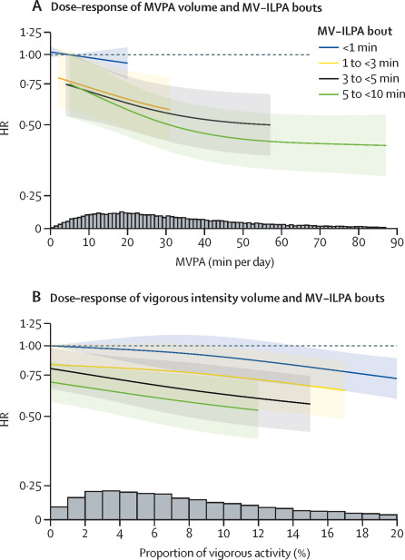 此外,高强度运动的占比也对健康效益产生了重要影响:如果MV-ILPA中至少有12%是高强度运动时,即使是少于1分钟的MV-ILPA,也与全因死亡风险下降22%有关;如果3-5分钟的MV-ILPA中有12%的高强度运动(每次22至40秒)的话,全因死亡风险可下降55%。