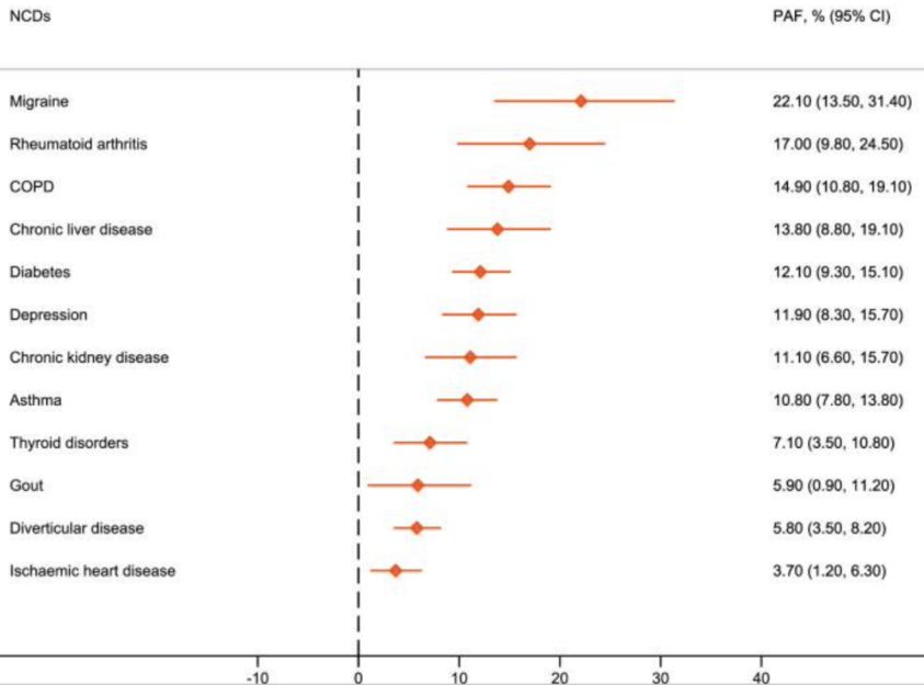 此外,柳叶刀子刊eClinicalMedicine上刊登的超大型队列研究显示[2]:每天久坐>6小时,与12种非传染性疾病的风险增加有关。而如果所有参与者的久坐时间均降低到每天6小时以下,将会减少3.7%-22.1%的非传染性疾病病例!如果用等时的剧烈体育活动(VPA)取代1小时的久坐,则能使糖尿病、抑郁症、肝病、憩室病和睡眠障碍的风险降低11-31%。