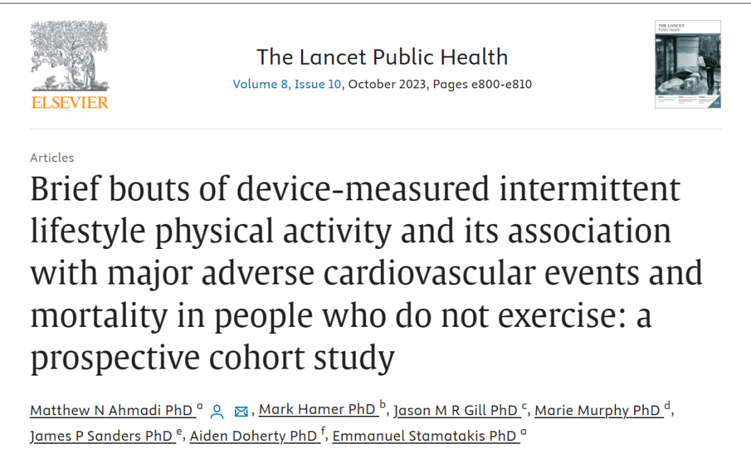 [3] Ahmadi MN, Hamer M, Gill JMR, et al. Brief bouts of device-measured intermittent lifestyle physical activity and its association with major adverse cardiovascular events and mortality in people who do not exercise: a prospective cohort study. Lancet Public Health. 2023;8(10):e800-e810. doi:10.1016/S2468-2667(23)00183-4