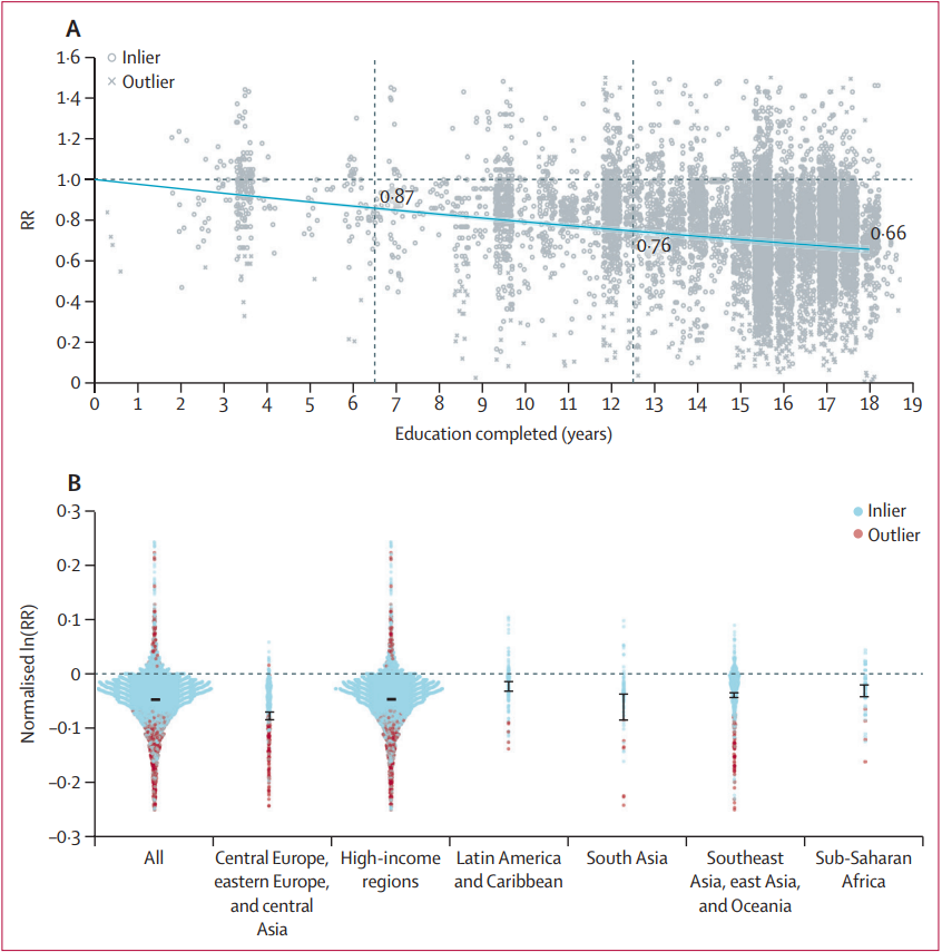 当然,作者在解释这项研究结果时也考虑到了其局限性。首先,本综述中确定的大多数研究数据都来自高收入环境,这是由于低收入国家的数据稀缺导致的,当然,这一限制凸显了需要开展更多高质量研究,以了解高等教育对低收入和中等收入国家死亡风险的影响。