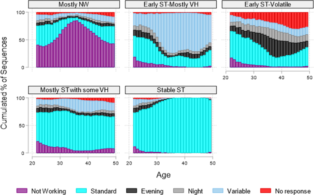 早期ST转不稳定:有17%的参与者在职业生涯早期(20多岁)遵循标准工作时间,然而在进入30多岁后,他们的工作时间表发生了显著变化,转向了各种不规律的工作安排。这类人群被标记为“早期ST不稳定”,因为他们经历了从标准时间向不稳定工作时间的过渡。