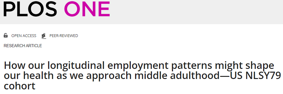 1. Han WJ. How our longitudinal employment patterns might shape our health as we approach middle adulthood-US NLSY79 cohort. PLoS One. 2024 Apr 3;19(4):e0300245. doi: 10.1371/journal.pone.0300245. PMID: 38568881; PMCID: PMC10990189.