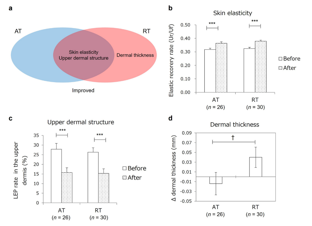 在基线测量时,AT组和RT组在参与者特征(如年龄、饮食摄入量、皮肤老化特性、身体成分和体能)方面没有发现显著差异。而在16周的训练之后,AT干预显著降低了体重和体重指数(BMI),并显著改善了作为有氧能力指标的峰值摄氧量(VO 2 peak,反映心肺功能),而RT干预则显著增加了瘦软组织质量和作为肌肉力量指标的1次重复最大值(1-repetition maximum)。皮肤弹性和上层真皮结构在两组中均表现为显著改善,其中,RT组的真皮厚度增加。