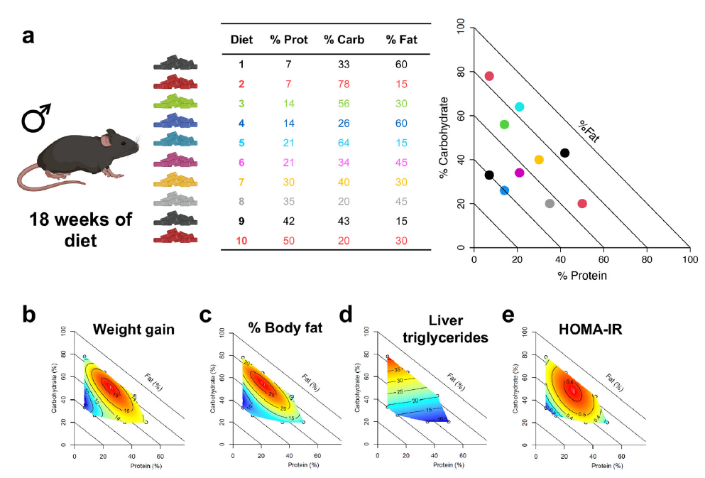 实验过程中,研究者将雄性小鼠分成10个组别,每组分别投喂热量相同、但宏量营养素比例各异的食物,例如蛋白质含量在10%-50%之间变动,脂肪占比10%-60%,碳水化合物占比30%-70%。在历经13周的特定饮食后,这些雄性小鼠与一直保持常规饲料饮食的雌性小鼠进行交配。而后研究人员对其雌性后代进行了全面细致的表型特征分析。
