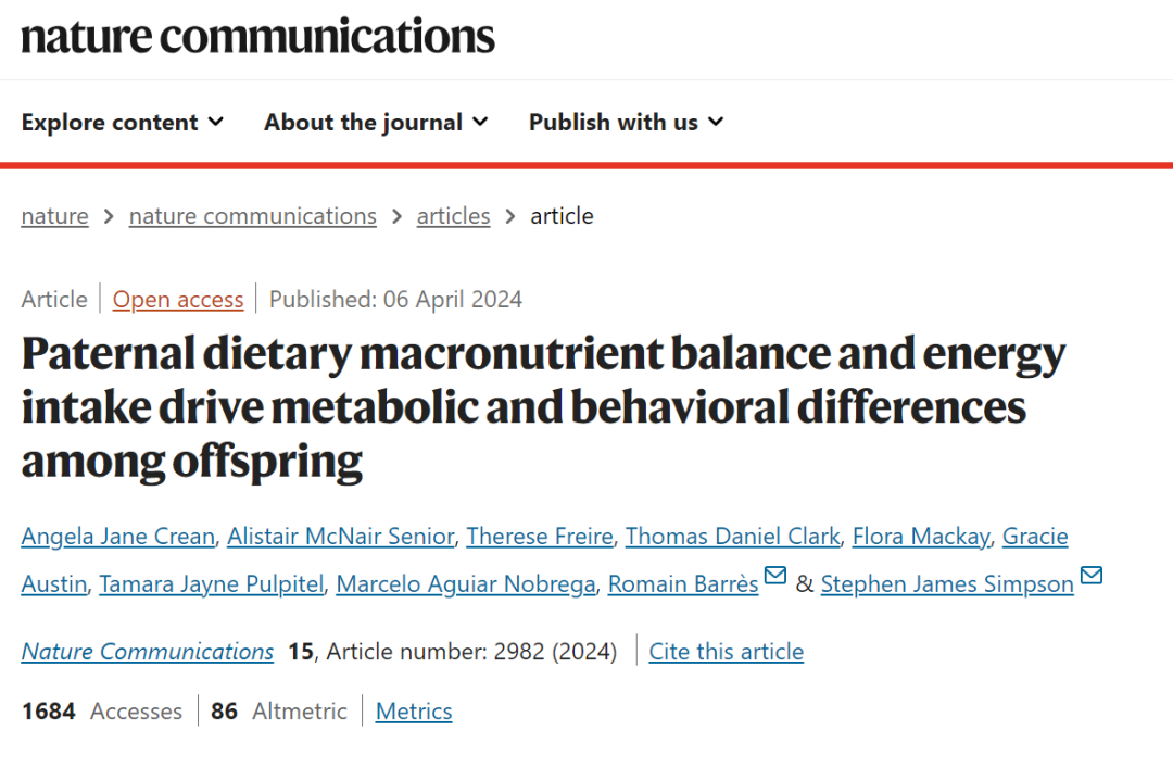 1. Crean, A.J., Senior, A.M., Freire, T. et al. Paternal dietary macronutrient balance and energy intake drive metabolic and behavioral differences among offspring. Nat Commun (2024). https://doi.org/10.1038/s41467-024-46782-y