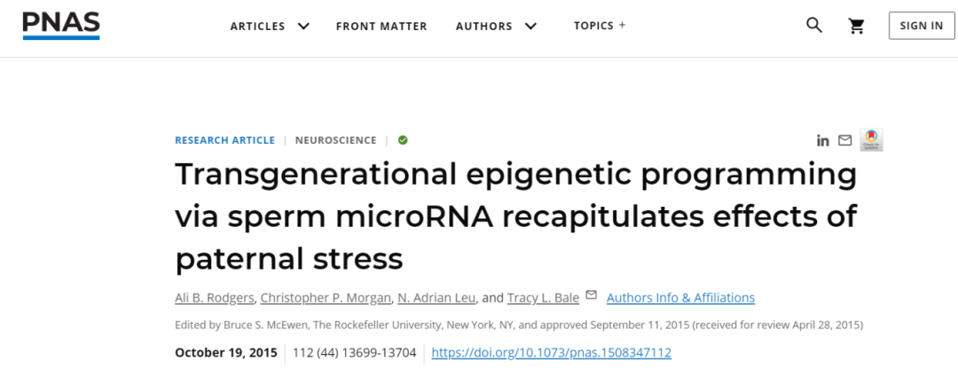 3. Rodgers AB, Morgan CP, Leu NA, Bale TL. Transgenerational epigenetic programming via sperm microRNA recapitulates effects of paternal stress. Proc Natl Acad Sci U S A. 2015 Nov 3;112(44):13699-704. doi: 10.1073/pnas.1508347112. Epub 2015 Oct 19. PMID: 26483456; PMCID: PMC4640733.
