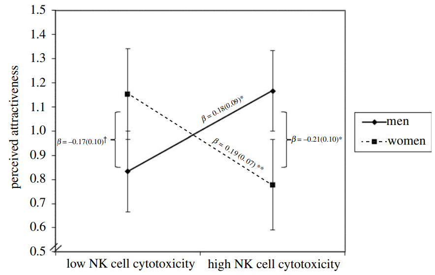 此外,研究发现性别差异明显的关联,即在男性中,吸引力与NK细胞功能正相关,而在女性中则呈负相关。这一发现提示,吸引力可能与基于血液的抗菌免疫和NK细胞功能有关。