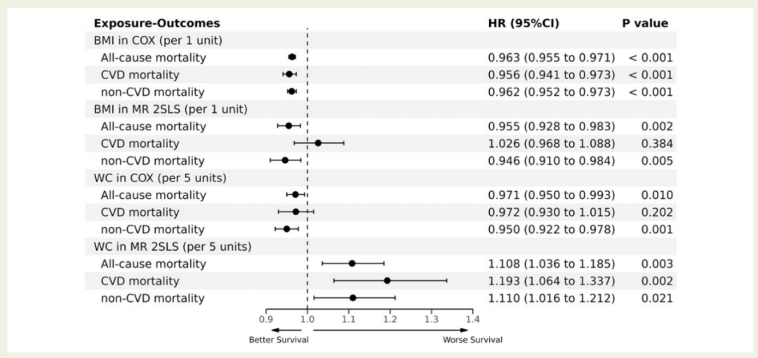 观察性分析结果显示,较高的BMI和腰围均与死亡风险降低相关,具体来说,BMI每增加1 kg/m2,全因死亡风险降低3.7%;而腰围每增加5 cm,全因死亡风险降低2.9%。