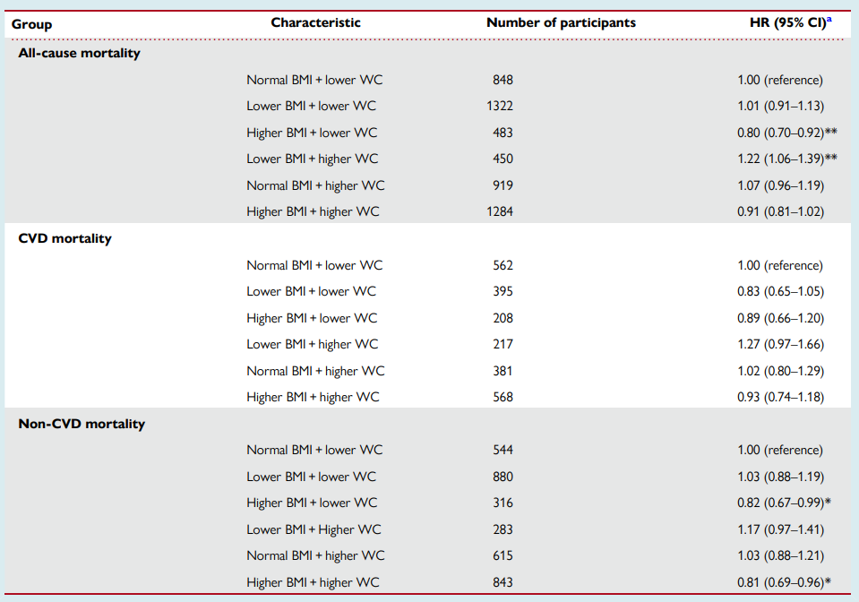 结果显示,与遗传预测BMI水平正常、遗传预测腰围水平较低的受试者相比,BMI较高、腰围较低的受试者全因死亡风险降低20%(HR 0.80),而BMI较低、腰围较高的受试者死亡风险增加22%(HR 1.22)。通俗点来讲,也就是微胖腰细的人最长寿。