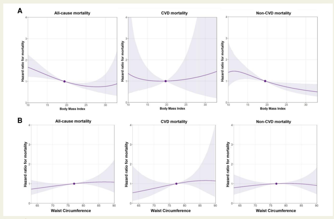 近日,中国疾病预防控制中心施小明、吕跃斌等人在国际心血管专业顶级期刊《European Heart Journal》发表了一篇题为“Body mass index, waist circumference, and mortality in subjects older than 80 years: a Mendelian randomization study”的研究论文[1],研究结果出人意料!结果显示:在高龄(≥80岁)人群中,BMI较高且腰围较低的体型,可以显著降低死亡风险。