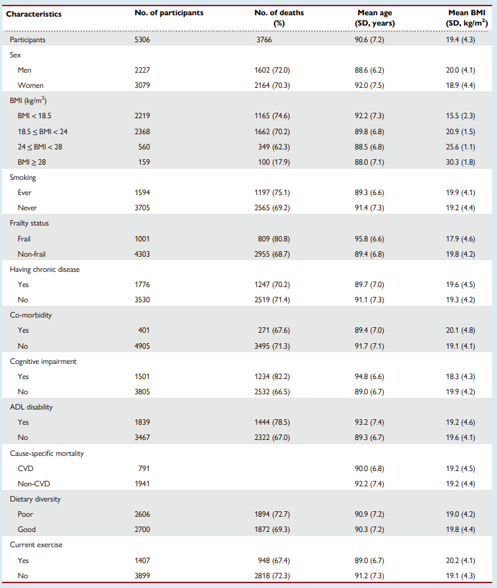基线特征显示,受试者平均年龄为90.6±7.2岁,其中42.0%为男性。平均BMI和腰围分别为19.4kg/m2和79.5cm,体重不足占比41.8%,体重正常占比44.6%,超重占比10.6%,肥胖占比3.0%。在长达20年的随访期间,共记录了3766名受试者死亡,2732人(72.5%)被确定了死亡原因,其中,791人死于心血管疾病,1941人死于非心血管疾病。