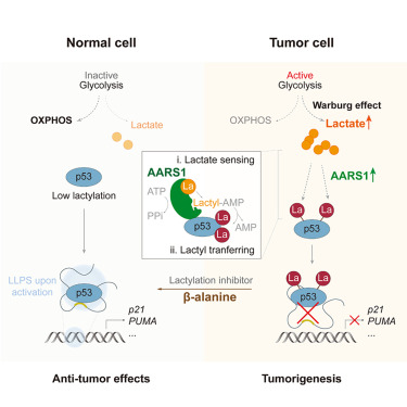 此外,大肠杆菌的AlaRS(EcAlaRS)也被证实能跨物种催化真核蛋白及p53的乳酸化,可见AARS1的乳酸转移酶活性具有深远的进化历史和高度保守性。AARS1能够诱导p53的DNA结合域发生特定位点乳酸化,阻碍其与p53响应元件DNA的结合,进而干扰p53的液相分离与转录活性。研究还提出利用β-丙氨酸竞争性结合AARS1以抑制p53乳酸化,为增强化疗效果提供了新策略。