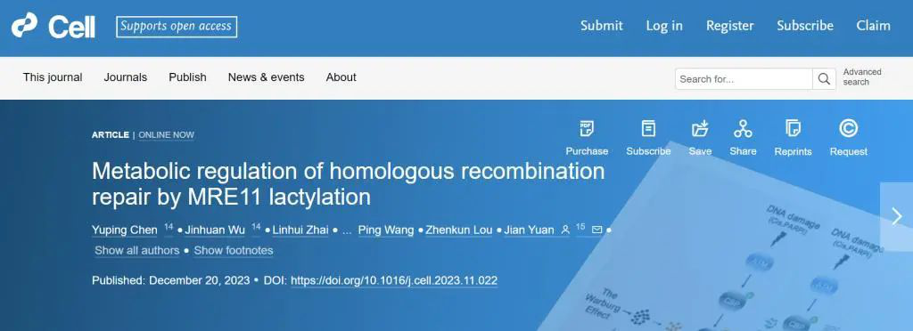 [2]. Chen Y, Wu J, Zhai L, et al. Metabolic regulation of homologous recombination repair by MRE11 lactylation. Cell. 2024;187(2):294-311.e21. doi:10.1016/j.cell.2023.11.022