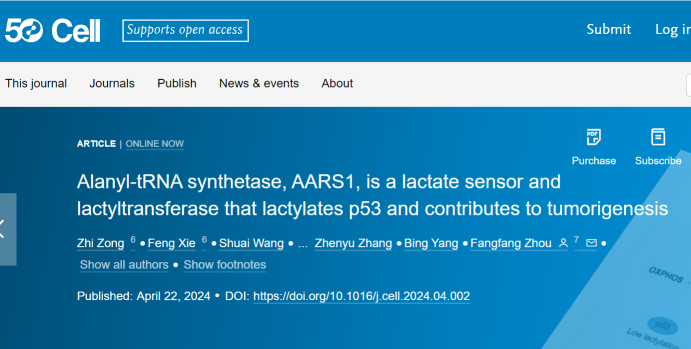 [1]. Zong Z, Xie F, Wang S, et al. Alanyl-tRNA synthetase, AARS1, is a lactate sensor and lactyltransferase that lactylates p53 and contributes to tumorigenesis. Cell. Published online April 17, 2024. doi:10.1016/j.cell.2024.04.002
