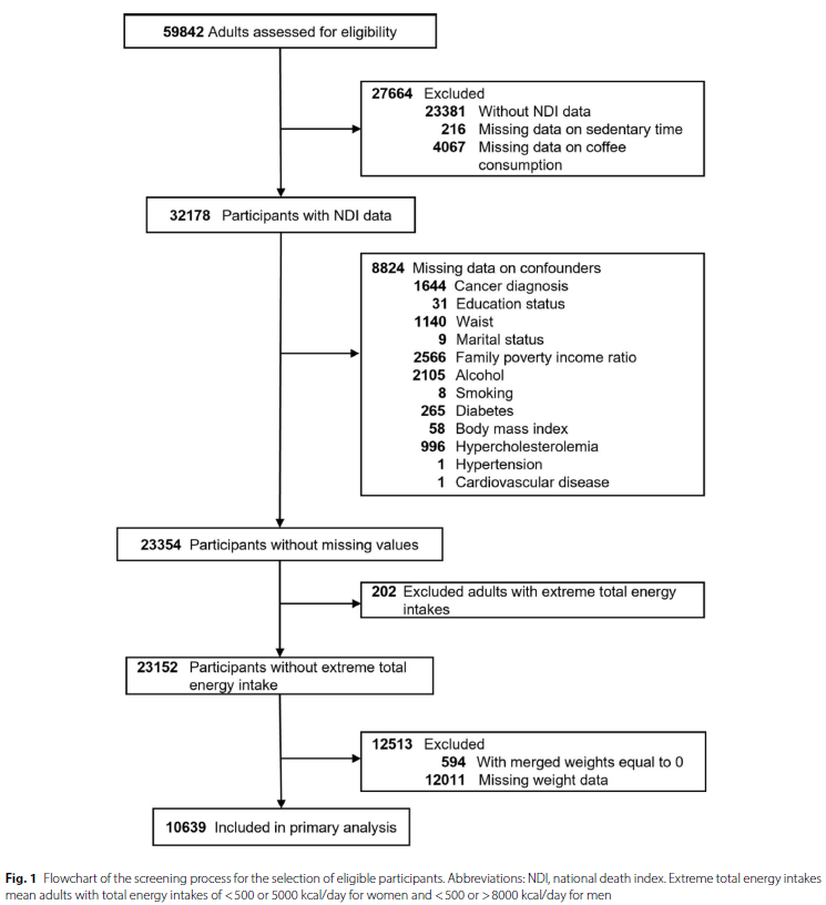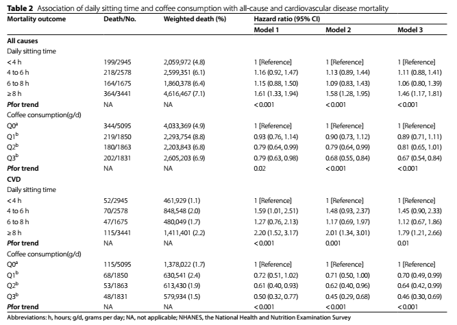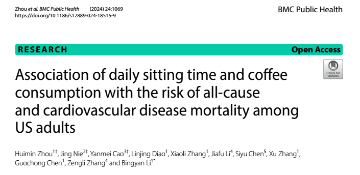Zhou H, Nie J, Cao Y, et al. Association of daily sitting time and coffee consumption with the risk of all-cause and cardiovascular disease mortality among US adults. BMC Public Health. 2024;24(1):1069. Published 2024 Apr 17. doi:10.1186/s12889-024-18515-9