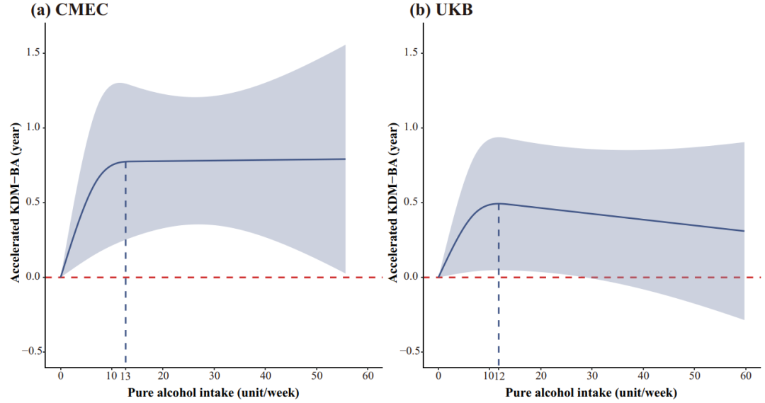 纯酒精摄入与KDM-BA加速之间的关系表现为一种非线性剂量-反应曲线,当每周纯酒精摄入量低于13个单位(CMEC队列)和12个单位(UKB队列)时,衰老的加速程度相对更快。 而当高于这个单位时,衰老的速度不再增加。