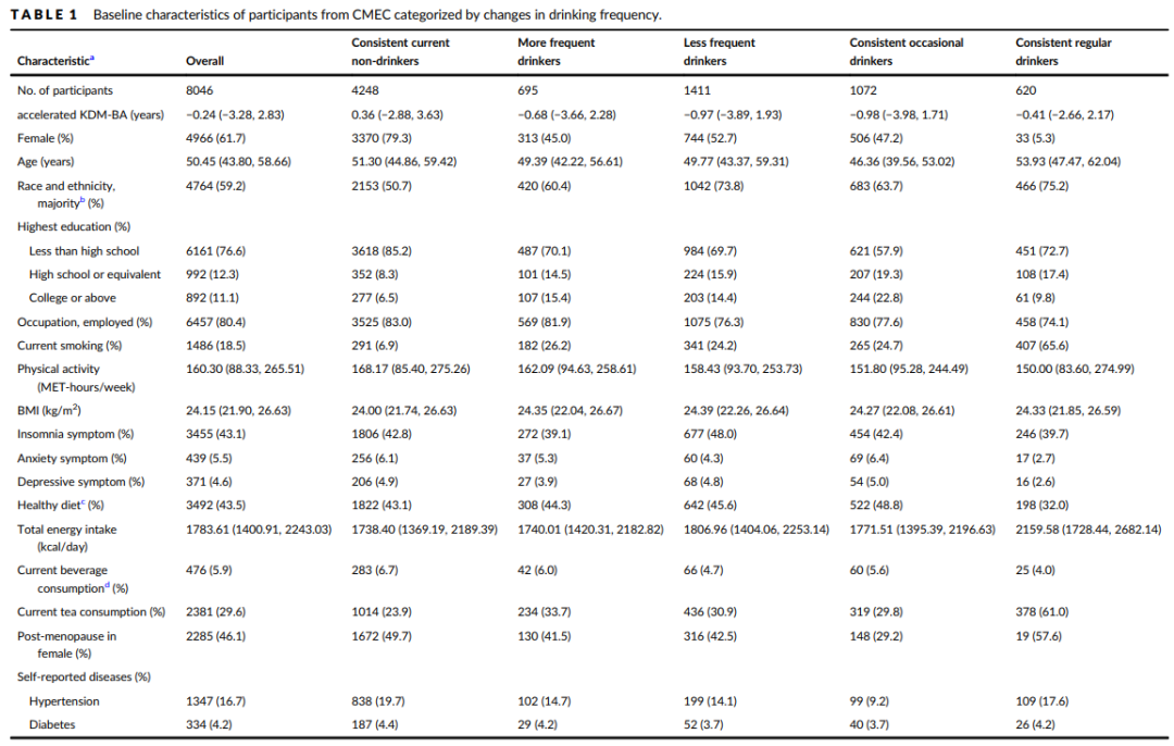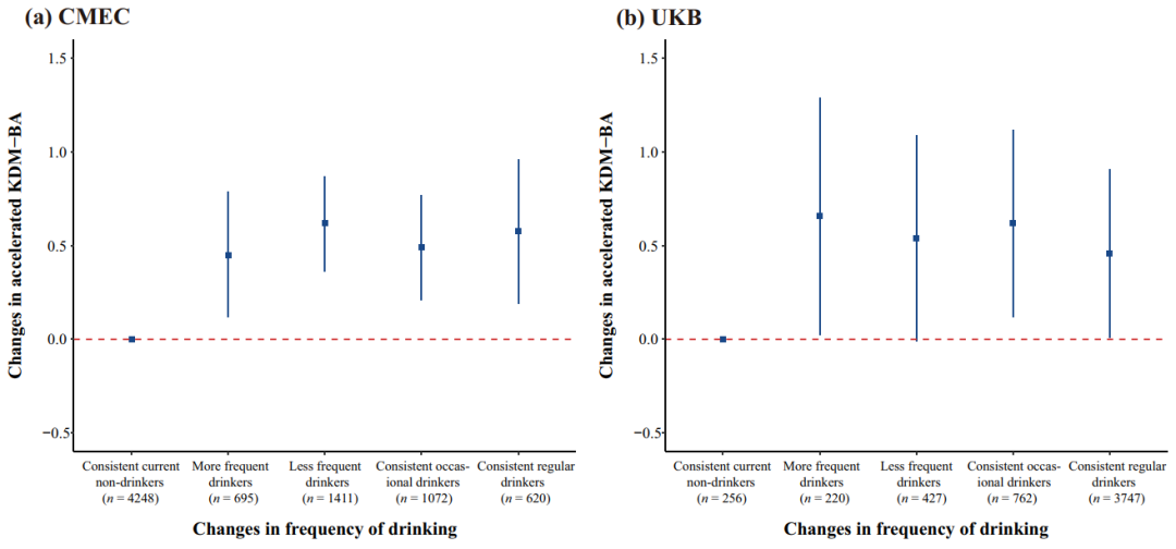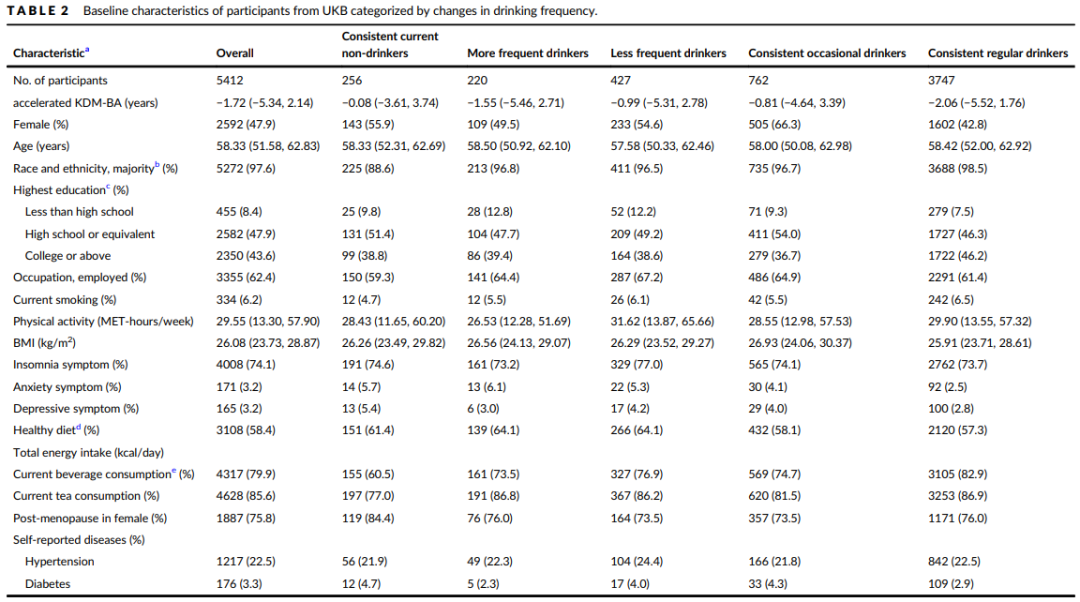 通过分析两组研究人群中饮酒频率的变化情况和参与者的基本人口学特征,研究结果显示,无论饮酒频率是否变化,与不饮酒者相比,饮酒者都表现出更高的生物年龄加速。这个发现为饮酒对生物年龄影响的研究提供了基础数据和背景信息。