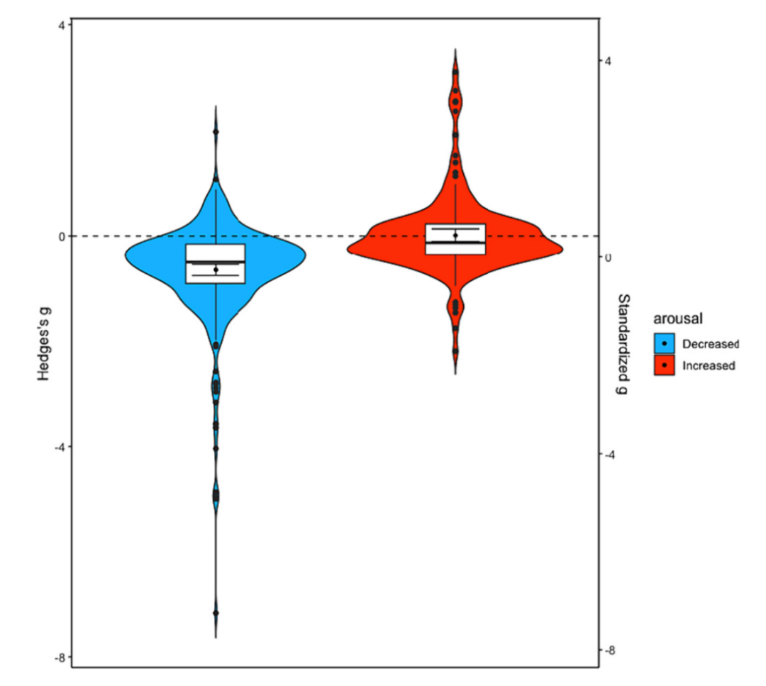 在73项提高唤醒度的研究中,平均Hedges ' s g为0.02,95 % CI为0.13 ~ 0.09,暗示两个群体间存在一些差异,这些差异在统计上可能不是非常显著。
