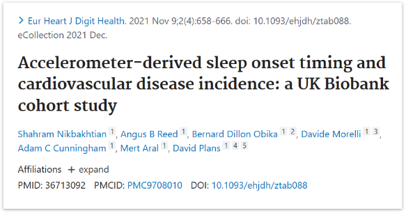 [1] Nikbakhtian S, Reed AB, Obika BD, et al. Accelerometer-derived sleep onset timing and cardiovascular disease incidence: a UK Biobank cohort study. Eur Heart J Digit Health. 2021 Nov 9;2(4):658-666.