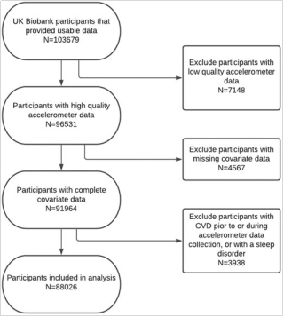 本研究依托英国生物银行(UKB),103712名参与者于2013年至2015年间接受了腕戴式加速度计的佩戴,并提供了7天的加速度计数据。经过数据筛选,最终纳入研究分析的共为88026名参与者。