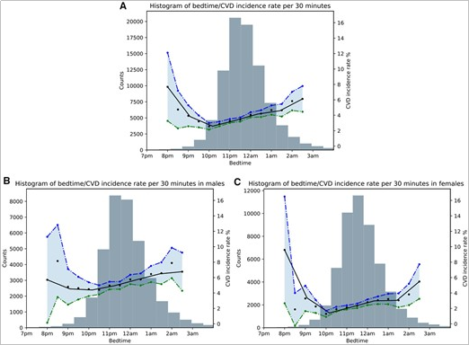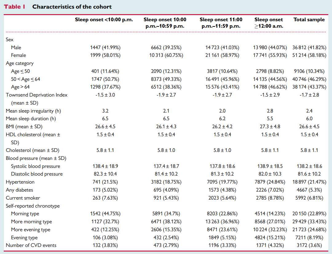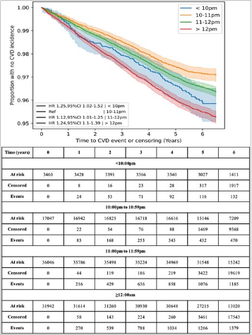 研究人群基线特征为:51214名女性(占比57.9%)及36812名男性(占比41.6%),年龄在43-79岁之间。在随访期间(平均5.7±0.49年)发生心血管疾病的3172名受试者中,入睡时间(sleep onset time,SOT)在晚上12点之后的有1371人 (占比43%),SOT在晚上11点至12点之间的有1196 人(占比38%),SOT在晚上10点至11点之间的有473 人(占比15%),SOT在10点之前的有132 人(占比4.2%)。
