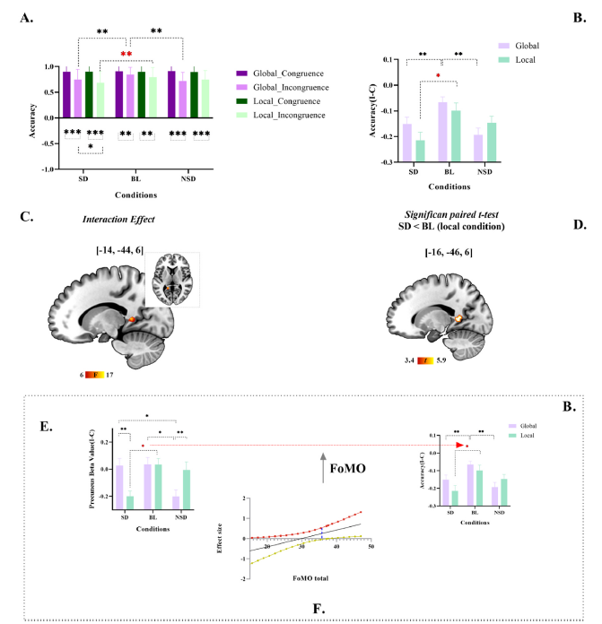 此外,该研究还探讨了错失恐惧症(FoMO)如何影响这一关系。数据显示,FoMO的水平在社交信息干扰下对于小脑上皮的激活与行为表现准确率之间的关系起到了调节作用。在局部任务中,当FoMO水平较高时,小脑上皮的减少激活与行为表现准确率降低之间的关系更为显著。这表明高FoMO水平的个体可能更敏感于社交媒体的干扰,从而影响其注意力分配和处理效率(图4)。