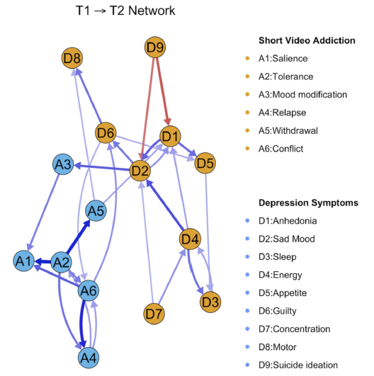 研究者把2021年和2022年这两个时间点分别用T1和T2标记,交叉滞后面板网络模型(CLPN)的计算结果显示,在两个时间点T1和T2间,参与者的短视频成瘾和抑郁症状均有所增加。