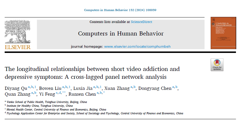[1] Qu, Diyang, et al. "The longitudinal relationships between short video addiction and depressive symptoms: A cross-lagged panel network analysis." Computers in Human Behavior 152 (2024): 108059.