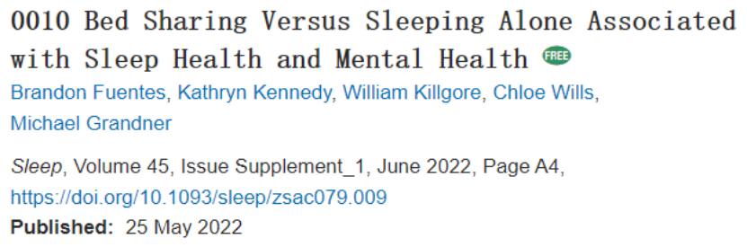 [2] Brandon Fuentes, Kathryn Kennedy, William Killgore, Chloe Wills, Michael Grandner, 0010 Bed Sharing Versus Sleeping Alone Associated with Sleep Health and Mental Health, Sleep, Volume 45, Issue Supplement_1, June 2022, Page A4,
