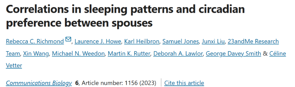 [1] Richmond, Rebecca C et al. “Correlations in sleeping patterns and circadian preference between spouses.” Communications biology vol. 6,1 1156. 13 Nov. 2023, doi:10.1038/s42003-023-05521-7