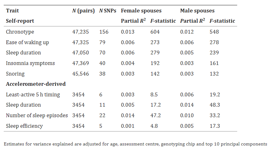 配偶对之间的问卷调查所得结果和加速度计衍生的睡眠特征是有联系的:配偶之间的睡眠持续时间、睡眠质量是互相影响的。打鼾会一定程度导致失眠,缩短睡眠持续时间。