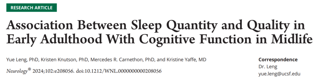Leng, Yue et al. “Association Between Sleep Quantity and Quality in Early Adulthood With Cognitive Function in Midlife.” Neurology vol. 102,2 (2024): e208056.