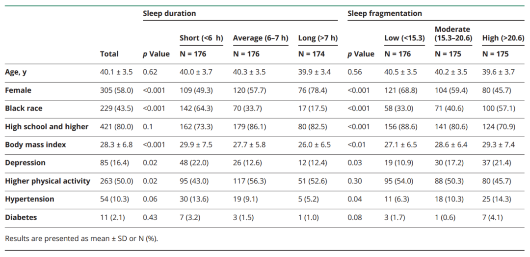 进一步,研究人员还观察了睡眠分段,即衡量睡眠中反复短暂中断的指标。他们观察了在睡眠期间活动的时间百分比和一分钟内身体不活动的时间百分比。将这两个百分比相加后,研究人员发现参与者的平均睡眠分段为19%。然后,研究人员根据参与者的睡眠分段得分将其分为三组。