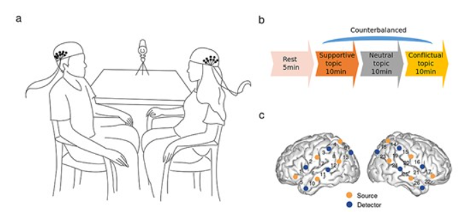 来自北京师范大学发展心理研究所、美国加州大学心理科学系等的研究人员就试图解开人际交往中一个长久以来的谜题:在情感的波动中,尤其是面对冲突时,情侣之间的大脑活动是如何相互影响的?他们通过使用功能性近红外光谱来收集情侣、异性朋友在讨论冲突、中立或支持性话题时的血流动力学信号,结果显示:情侣在争执时,他们大脑的神经同步性显著增加,而这种同步性与情绪的唤醒程度紧密相关,本身激发的强烈情绪会让双方的大脑更加“同频共振”。