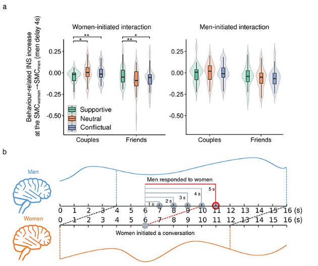 结果发现,在情侣中,人际冲突比人际支持更能增加人际神经同步 (INS) ,即在意见不合的紧张时刻,情侣的大脑活动竟实现了更深层次的共鸣。