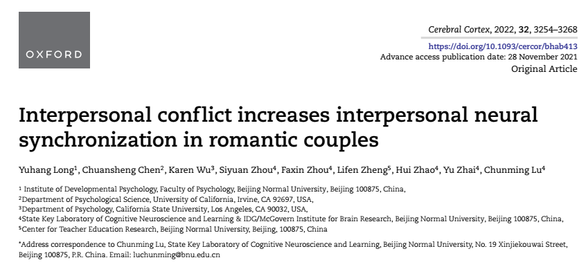 研究发布于Cerebral Cortex,题为“Interpersonal conflict increases interpersonal neural synchronization in romantic couples”。