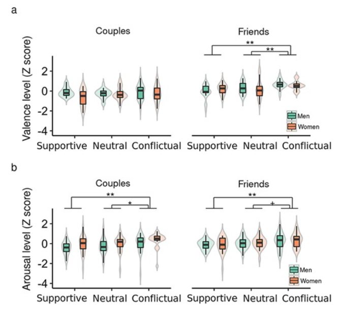 研究结果显示:在效价水平方面,夫妻组在不同主题间没有表现出显著差异,意味着夫妻双方在面对各种类型的话题讨论时,情感的正面或负面感受相对稳定,不会因话题的性质而有剧烈波动。而朋友组的结果则呈现出不同的情景,显示出显著的主题主效应,尤其是冲突性主题相较于支持性主题,激发了更多的正向情感评价(相对于夫妻关系,朋友之间可能在表达负面情绪上更加自由和直接,冲突性话题的讨论为情绪的健康释放提供了渠道,这种开放和真实的交流有助于增进相互之间的理解与接纳,从而转化为正面的情感体验)。