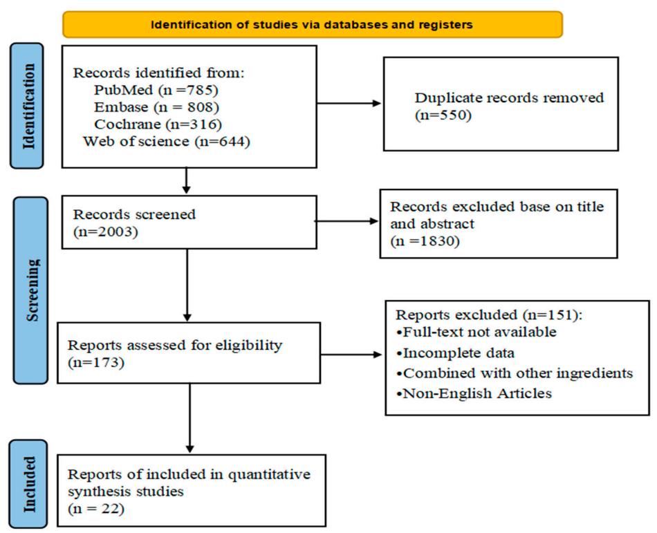 这是一项系统回顾和荟萃分析,首先,研究者广泛搜索了四个数据库(包括PubMed、Web of Science、Embase和Cochrane Library),收集了在2024年2月前的所有与大蒜对血糖参数和血脂水平影响相关的随机对照试验。其次,他们也设定了纳入研究的标准,包括随机临床试验、试验设计为平行或交叉设计、实验期超过2周,并且研究对象为18岁及以上的成年人等等,研究流程如图一所示。