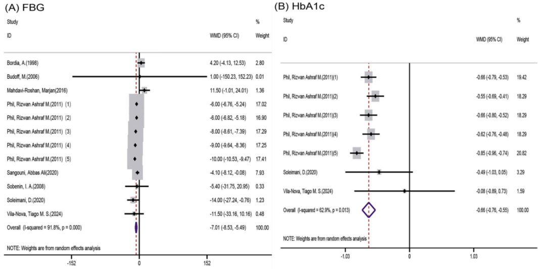 荟萃分析深入探讨了大蒜对血糖代谢指标的作用。针对空腹血糖(FBG),八项研究涵盖的12种效应量一致指出,大蒜干预能显著降低FBG水平,这一发现对于糖尿病患者来说尤其重要,因为它表明了大蒜可能在血糖管理中发挥作用。在评估糖化血红蛋白(HbA1c)的三项试验中,同样观察到大蒜对HbA1c水平有显著的正面影响,而改善HbA1c水平有助于减少糖尿病并发症的风险。