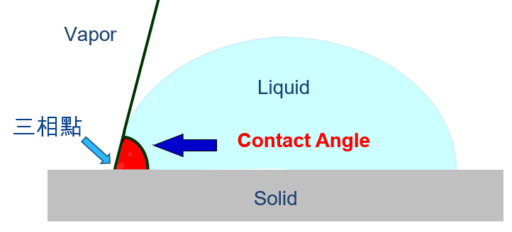 接触角(contact angle)是指在液体/气体界面接触固体表面而形成的夹角。接触角是液体表面张力的常见测量方式,可以反映液滴内的分子以及其与下方表面如何相互作用。例如,水在玻璃等表面上的接触角很小,其滴在玻璃上就会呈现为“珠状”,而高酒精浓度的酒精滴液则有更大的接触角,其在玻璃上就会平坦地展开。