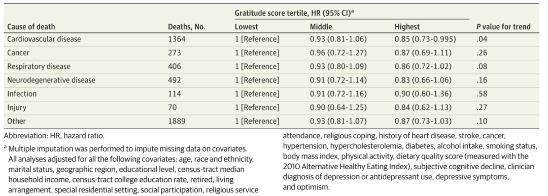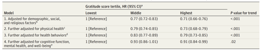 多变量调整比例风险分析表明,感恩水平与全因死亡率(特别是心血管疾病导致的死亡)存在明显的负相关关系。具体而言,与感恩水平最低的人相比,最感恩的那部分人,其死亡风险降低了大约29%。即便在调整了年龄、教育背景、收入水平、社会参与度、宗教活动、身体状况、生活习惯、认知功能以及心理健康状况等因素后,感恩与死亡率之间的负相关关系仍然显著。