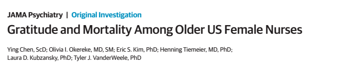 Chen Y, Okereke OI, Kim ES, Tiemeier H, Kubzansky LD, VanderWeele TJ. Gratitude and Mortality Among Older US Female Nurses. JAMA Psychiatry. Published online July 3, 2024. doi:10.1001/jamapsychiatry.2024.1687