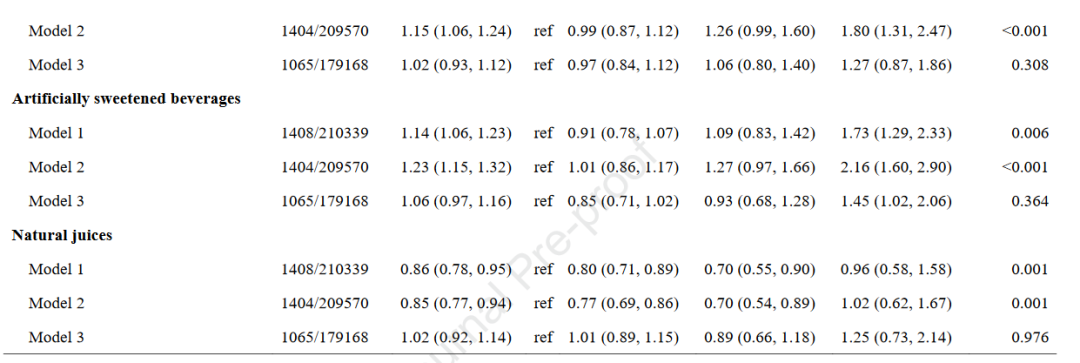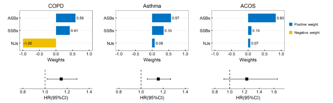 接着,研究者们还做了一个有趣的分析,他们想看看如果一个人同时喝这三种饮料,那么这些饮料加在一起对他们健康的影响是怎样的。他们发现,如果每天多喝一份这些饮料,无论是含糖的、人工甜味的还是天然的,都与COPD、哮喘和ACOS风险的增加有关,HR值分别为1.15(95% CI: 1.02, 1.29)、1.16(95% CI: 1.06, 1.27)和1.16(95% CI: 0.92, 1.65)。但是,在这三种饮料中,人工甜味剂饮料(ASBs)对健康的影响似乎更大一些,其次是含糖饮料(SSBs)。天然果汁(NJs)是唯一显示出对COPD有保护作用的饮料类别。