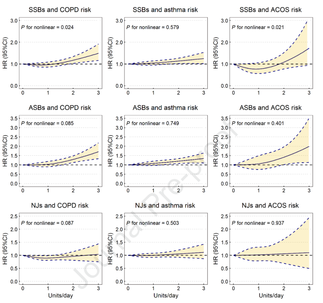 同时,含人工甜味剂饮料(ASBs)的摄入量与COPD、哮喘及哮喘-COPD重叠综合征(ACOS)的发病率增加呈剂量-反应关系,即摄入量越多,疾病风险越高。研究数据显示,对于上述三种疾病,连续HR值分别为1.98(95% CI: 1.36, 2.87)、1.65(95% CI: 1.24, 2.20)和2.84(95% CI: 1.20, 6.72),凸显了人工甜味剂饮料对呼吸系统健康的潜在不利影响。